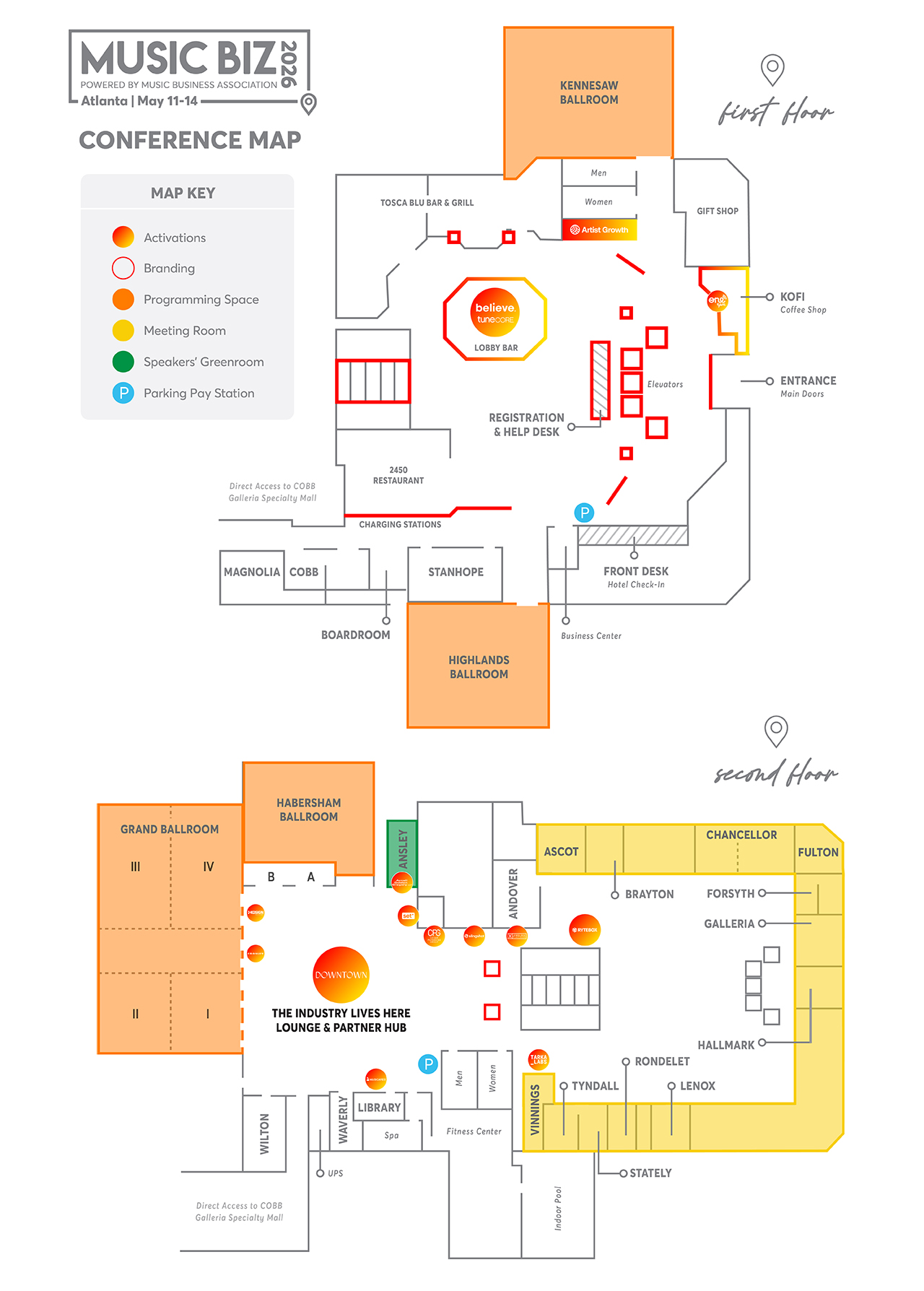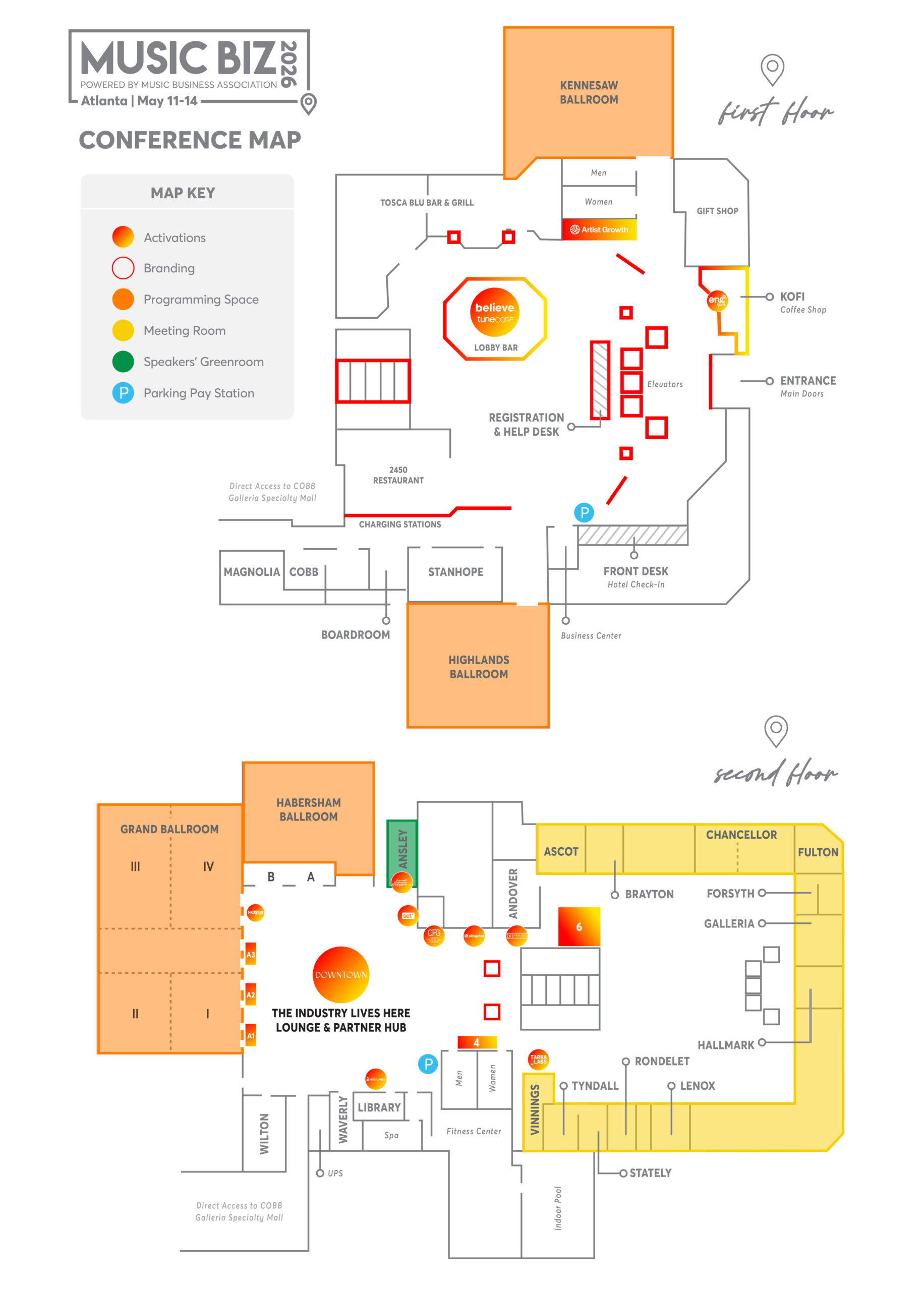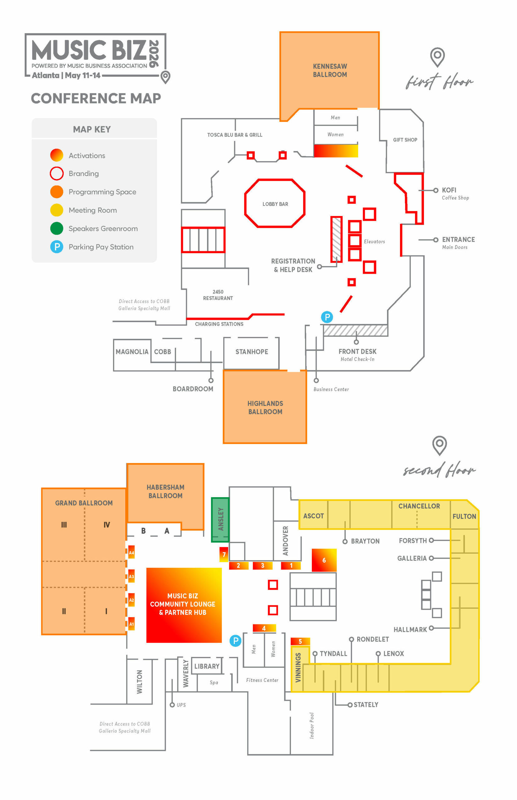Use the map below to get acquainted with the layout of where everything’s located at our host hotel, the Renaissance Atlanta Waverly — you can also click the map to download a PDF version!